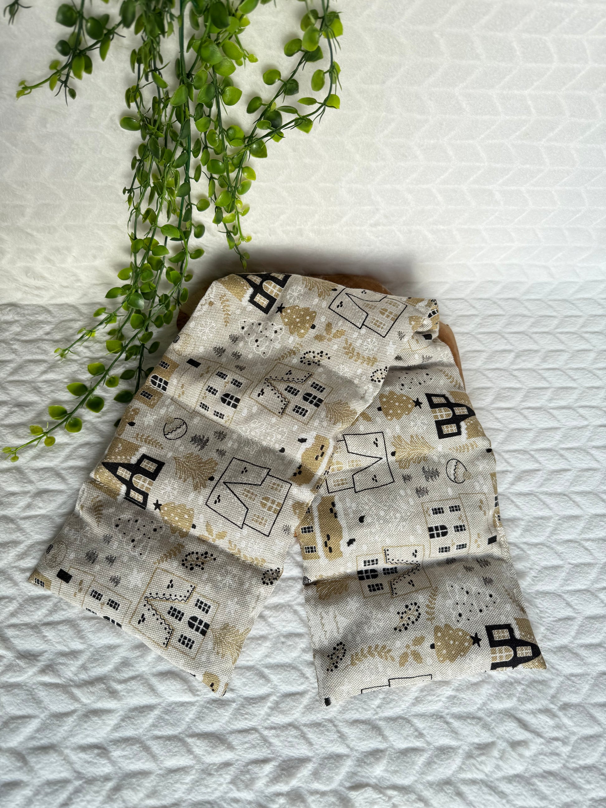 Sa forme allongée permet de bien enveloppé l'endroit douloureux. Une couture centrale permet de cloisonner la bouillotte et ainsi éviter que tous les noyaux de cerise ne se regroupent au même endroit.