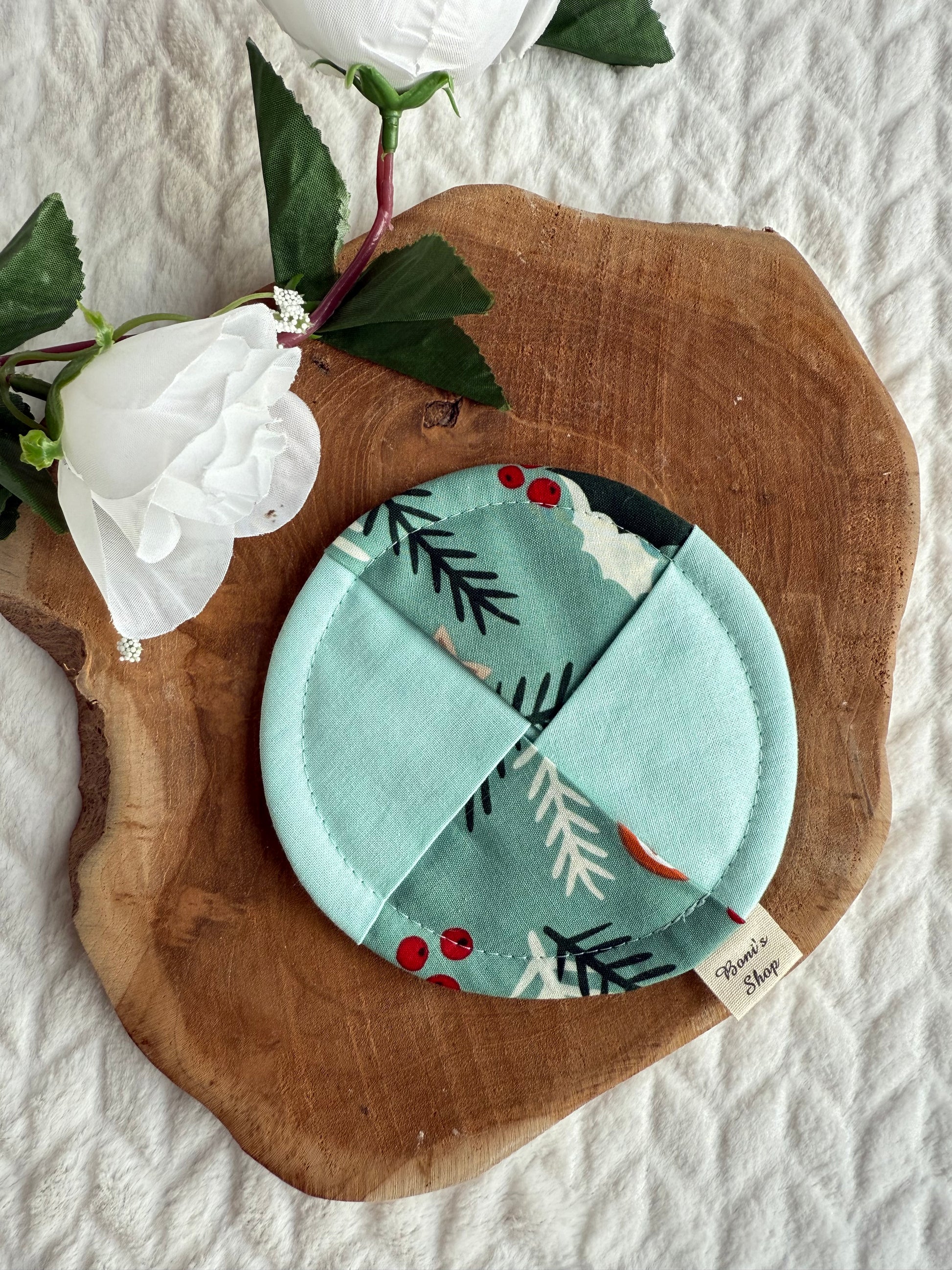 Confectionné à partir de coton de qualité, il présente de jolis motifs hivernaux : feuillage de sapin, petites baies rouges, et nuances douces rappelant la magie de Noël. Sa forme ronde et sa finitions soignée en font un accessoire à la fois pratique et décoratif.